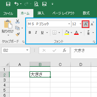 やり方②大きさを変えたいセルを選択してフォントグループのA▴をクリックして大きくして、A▾をクリックして小さくする。
