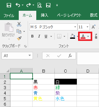 文字の色変更...変更したいセルを選択してフォントグループのAに線が引いてあるボタンの▼をクリック、好きな色を選択する。