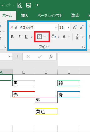 やり方 変更したいセルを選択してフォントグループの田と書いてあるボタンの▼をクリックして変更する。