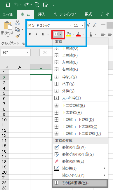 やり方 つけたいセルを選択してフォントグループの田と書いてあるボタンをクリックして変更する。