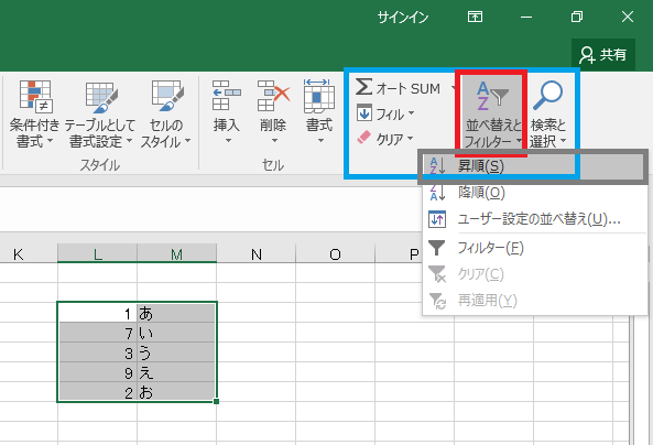 やり方 並べ替えしたいセルを基準にしたいセルから全て選択して編集グループの並べ替えとフィルターボタンをクリック、昇順・降順・ユーザー設定の並べ替えのどれかを選択して変更する。