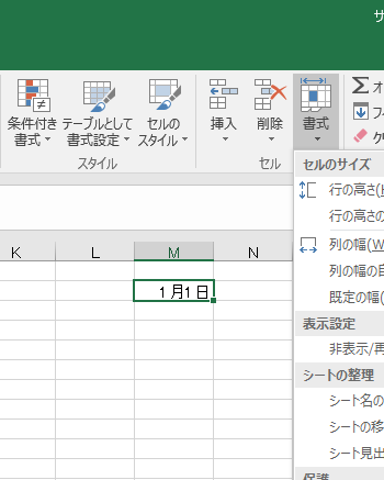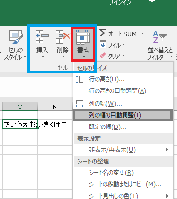 やり方 調整したいセルを選択してセルグループの書式ボタンをクリック、列・行の自動調整のタブをクリックして調整する。