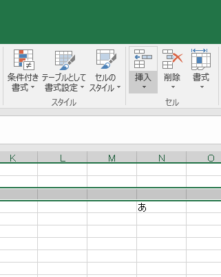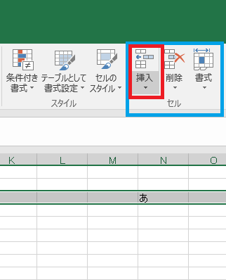 挿入 挿入したい所の下または右の行・列を選択してセルグループの挿入ボタンをクリックして挿入する。