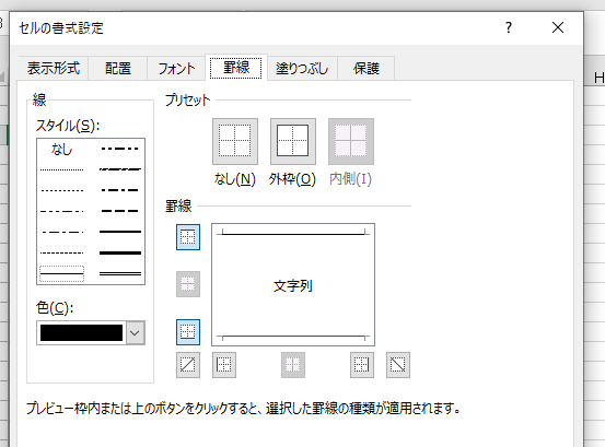 やり方 変更したいセルを選択してフォントグループの田と書いてあるボタンの▼をクリックして「その他の罫線」というタブをクリックして変更する。